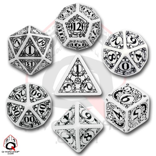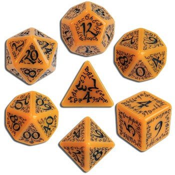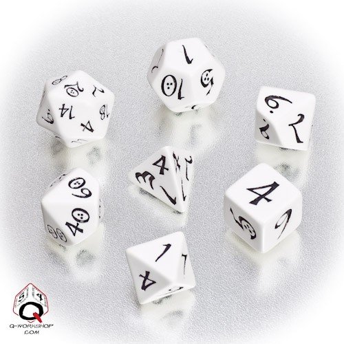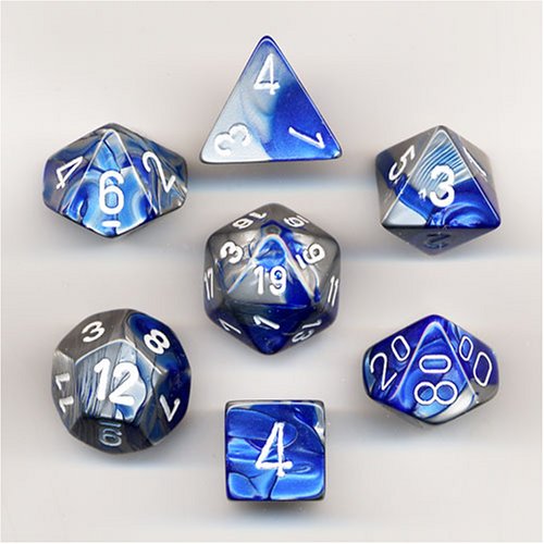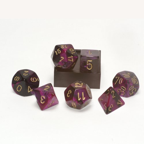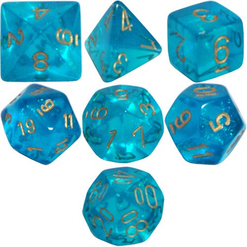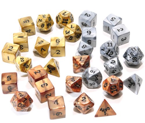 Opaque dice are made of a particularly dense material for a better feel when rolling. This material also allows for flatter faces and sharper edges. The wide variety of colors is also very consistent so that an opaque Chessex die from years ago will match those available today. These dice are very economical, at a fraction of the cost of others. This set contains one d20, one d12, two d10 (00-90 and 0-9), one d8, one d6, and one d4.