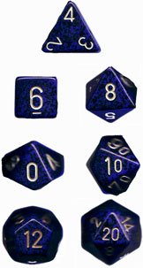 There are approximately 100 factory-second dice in this bag. (Number of dice will vary with the mix- four-siders are lighter than other shapes, for example.) These dice are mixed in a variety of styles & colors. Every bag does not necessarily have every style & color. Sizes may include 6, 8, 10, 12, 20 & 30-sided dice (and, possibly, other sizes) in colors that include (but are not limited to) speckled, marble, rainbow, opaque and translucent. This assortment features one complete 7-die polyhedral set of never-released speckled dice, available ONLY in the Pound O' Dice assortment.