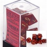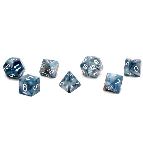 Gemini dice were introduced in 2006 and were immediately very popular. Each dice has a beautiful blend of two base colors, making these dice a unique addition to any dice collection. This set contains one d20, one d12, two d10 (00-90 and 0-9), one d8, one d6, and one d4.